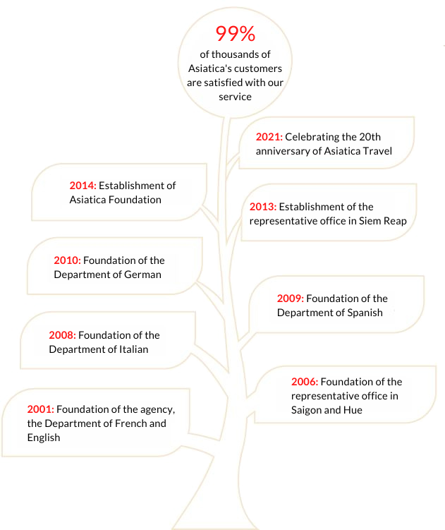 Asiatica Travel to wiodąca agencja turystyczna w Wietnamie, założona w 2001 roku. Z 25-letnim doświadczeniem jesteśmy Twoimi ekspertami w organizowaniu wycieczek do Wietnamu i Kambodży. Obecnie firma przekształciła się w międzynarodowe przedsiębiorstwo, zatrudniające 100 pracowników w 4 biurach. Oferujemy kompleksowe pakiety zawierające zakwaterowanie, loty krajowe, posiłki, prywatny transport oraz przewodników mówiących m.n. po polsku.